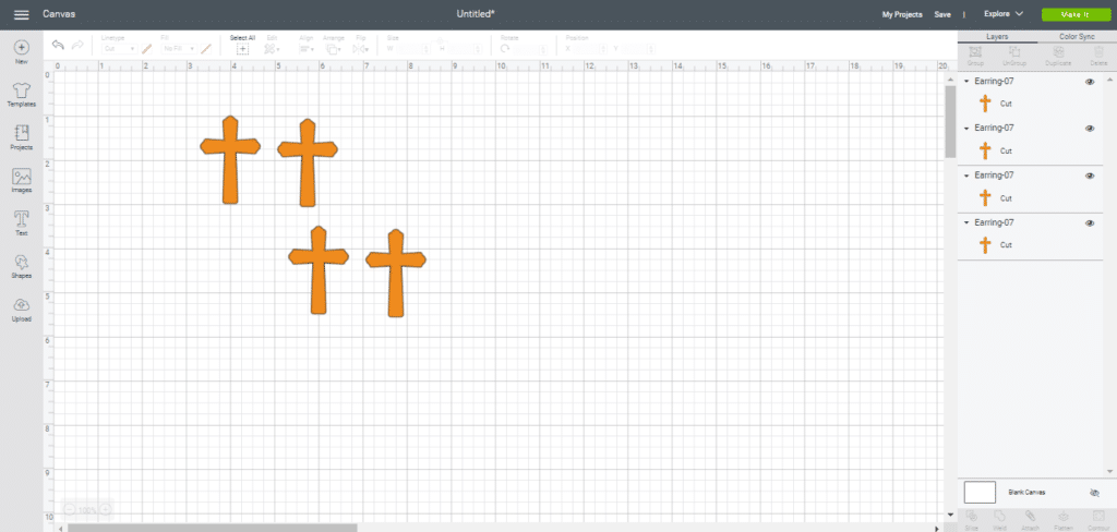 For this project, I am going to cut two additional crosses so that I can glue my back pieces back to back with another piece of material. I highlighted the two earrings by left clicking and drawing a square around them and then clicking on the Duplicate button.