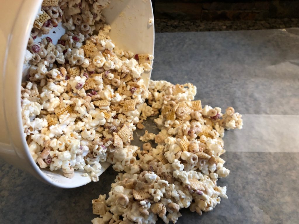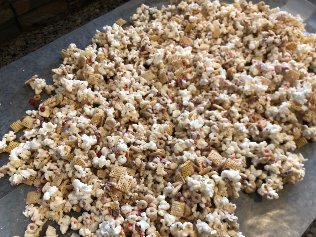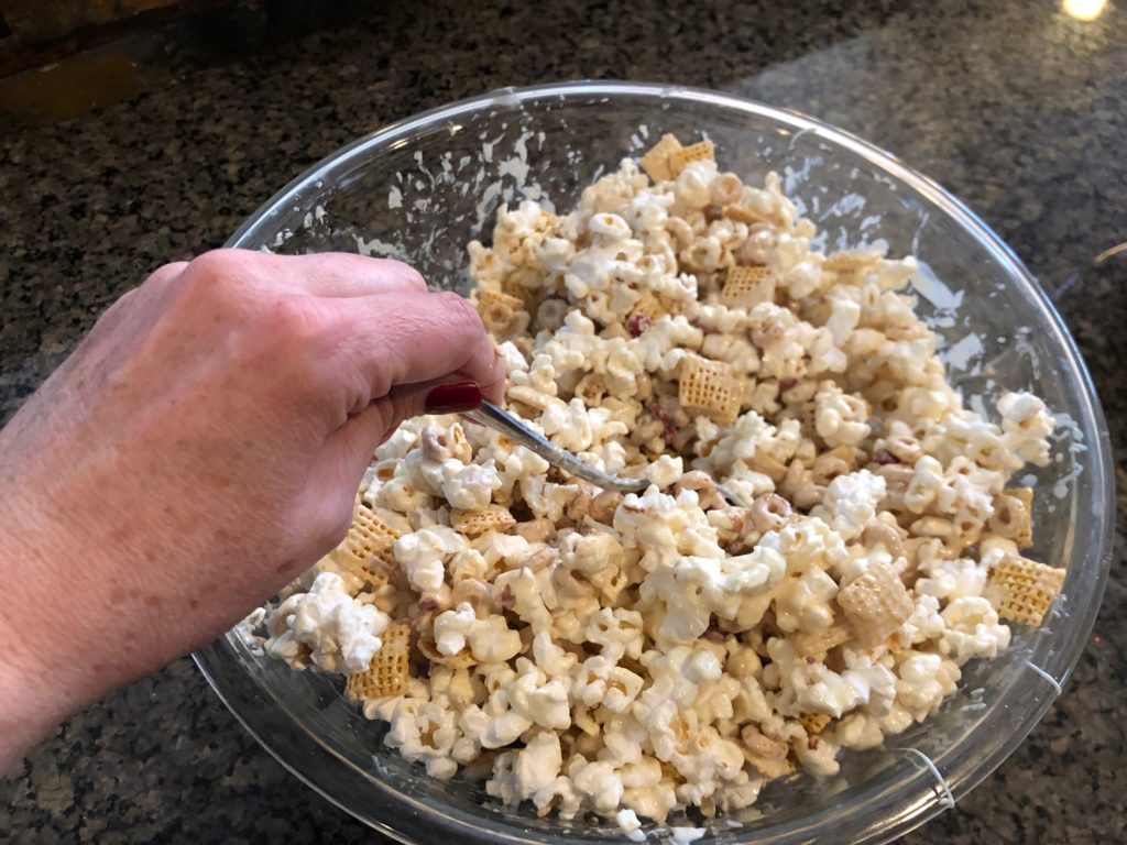 - This first step takes a VERY big bowl, bigger than any I have. Mix first five ingredients in a bowl. That includes the popcorn, Corn Chex, Cheerios, peanuts, and m&m’s. Since I needed to divide this amongst two bowls, I simply put 1 bag of popcorn, 1 cup of nuts, 1 cup of Corn Chex cereal, 1 cup of Cheerios, and 1/2 cup m&m’s into each bowl. And both bowls still ended up pretty full. I also put a little bit of sprinkles into the mix as well.