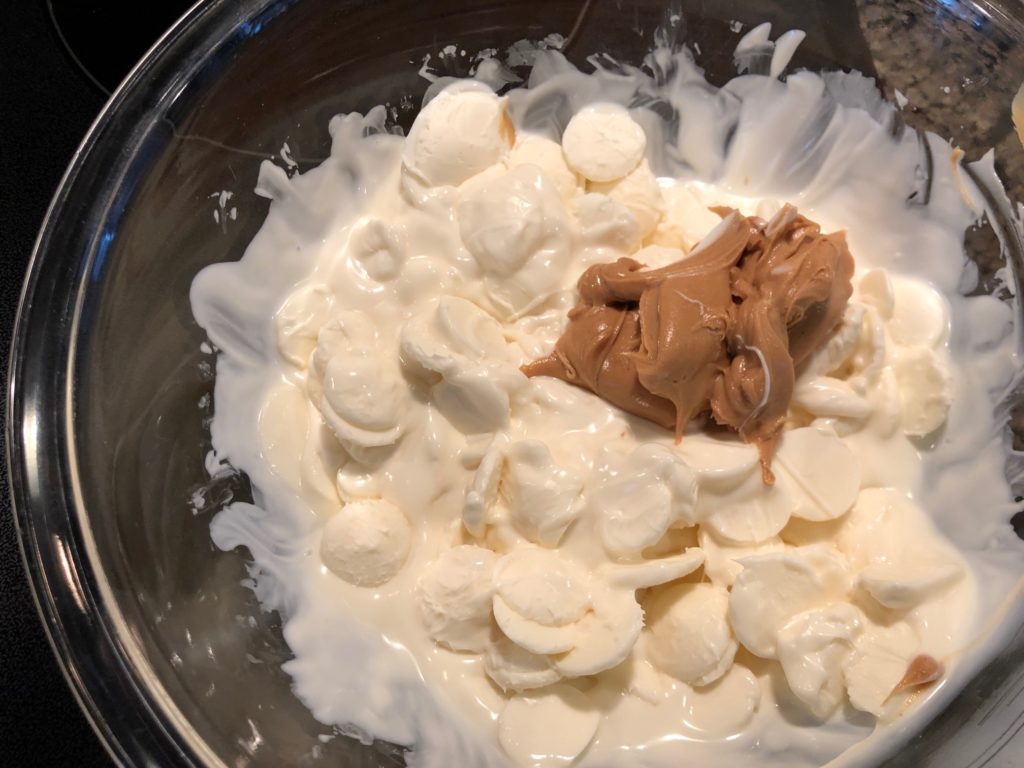 - Melt the white chocolate in the microwave, following instructions on the packaging. Once it starts to melt, add peanut butter and stir until smooth.
