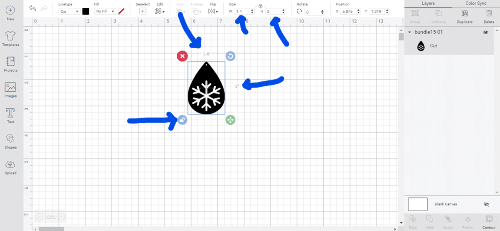 Since we’re going to iron on a piece of snowflake-shaped heat transfer vinyl, I don’t need to cut the snowflake out of the faux leather. To hide the snowflake, click on the teardrop image and then click on the Contour button.
