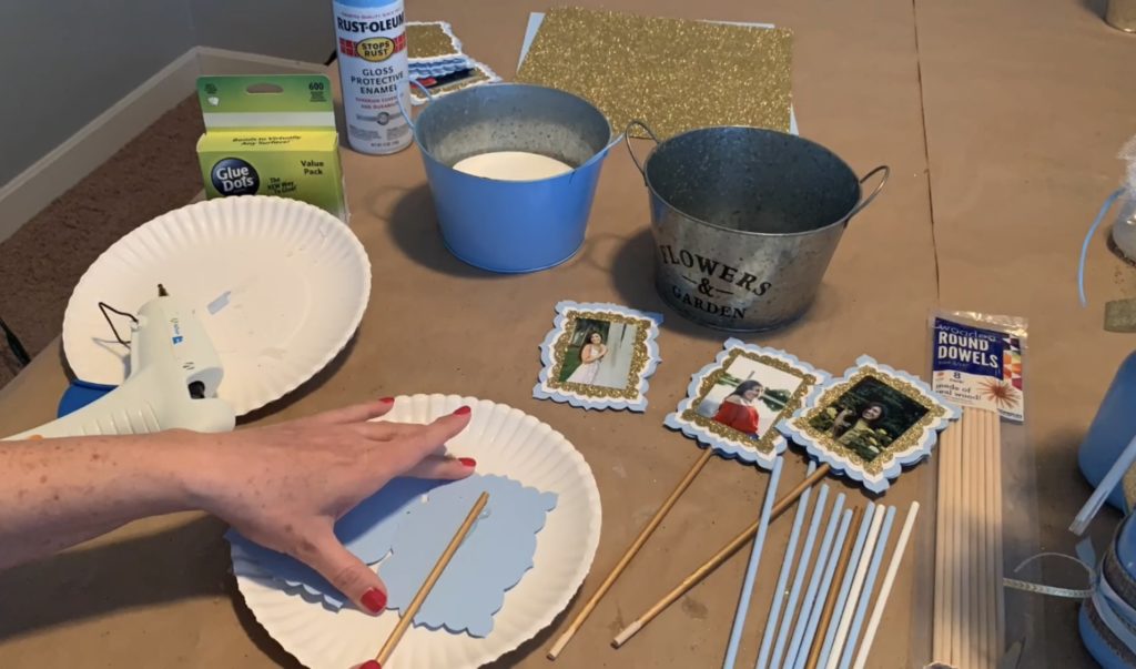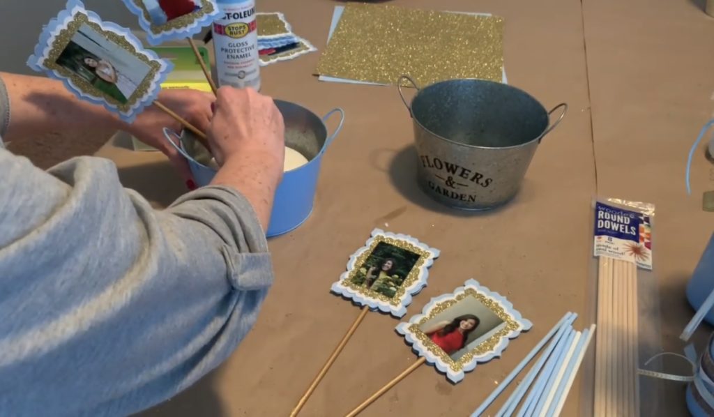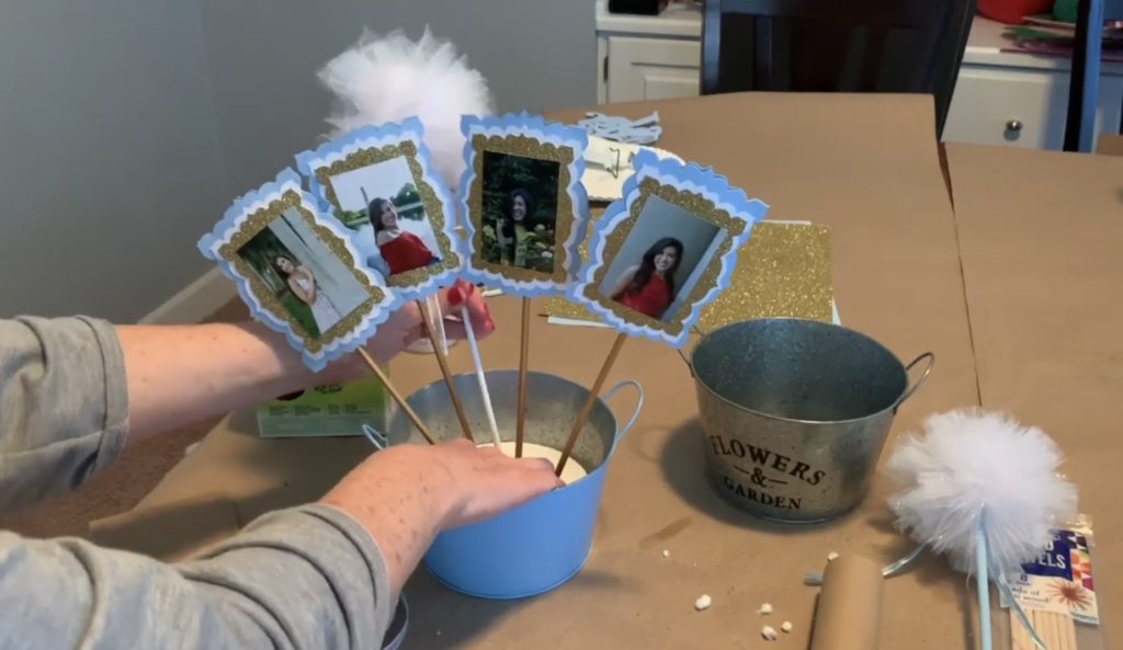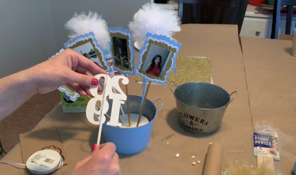 I adhered the three cardstock layers using glue dots and then added a senior photo to the front. For double-sided visibility, I originally glued photos back to back with the stick in the middle—but the pom poms blocked the view from the backside. Lesson learned! For future centerpieces, I’ll keep it single-sided.