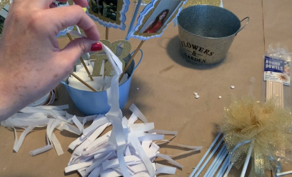 To finish, I made my own tissue paper shred by slicing and fluffing up a package of paper. It’s a cheap and cute filler that ties the whole graduation centerpiece together.