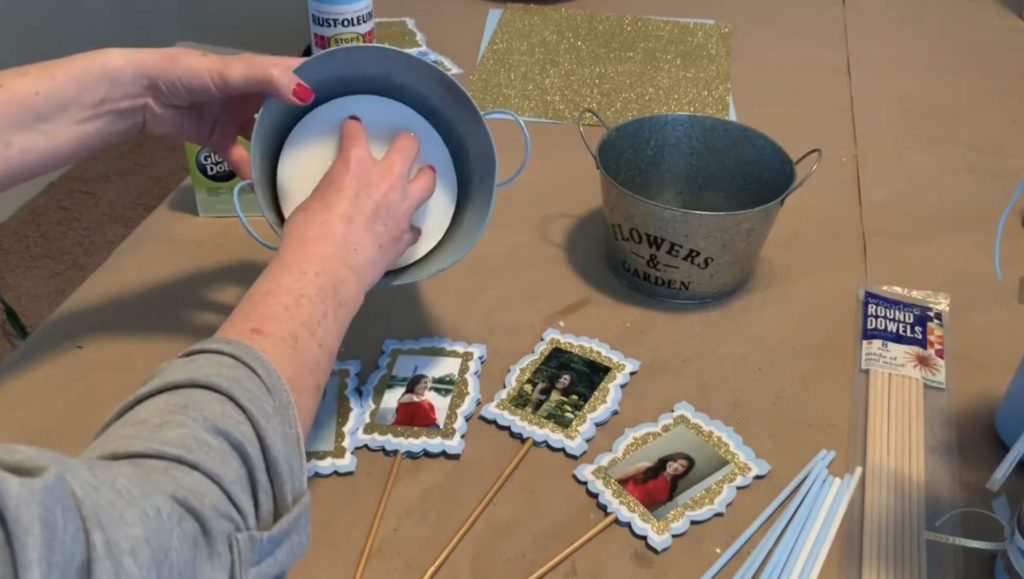 Insert Styrofoam into the galvanized container, then stick the photo rods into the foam. You make need to cut the Styrofoam to match the size of your container.