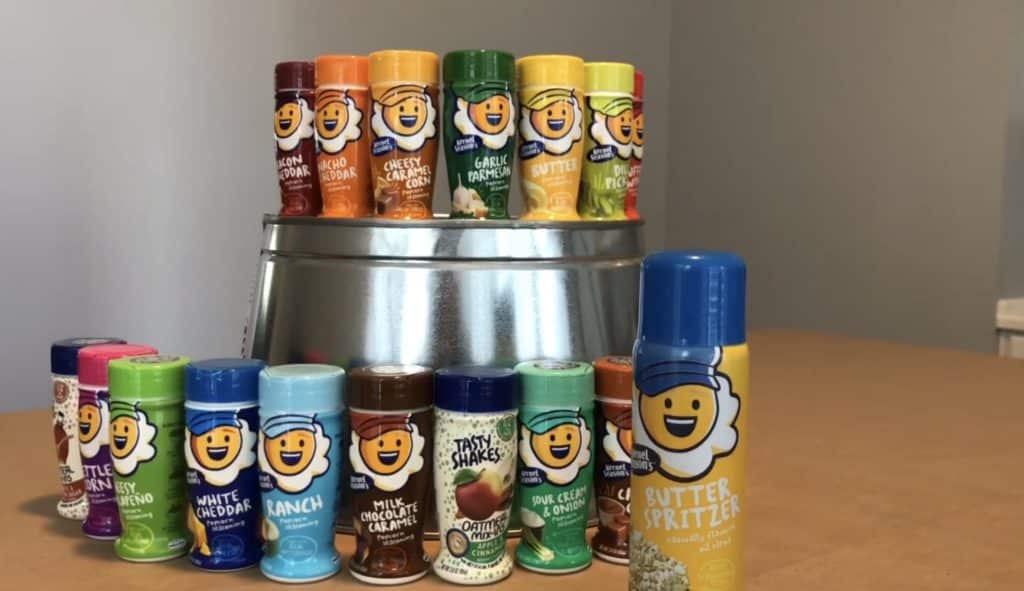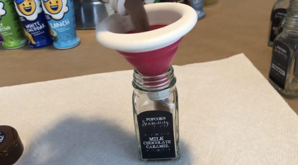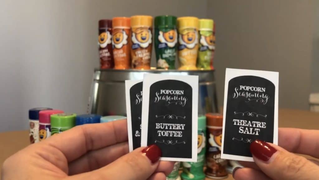 I recommend picking a few savory/salty flavors and a few sweet ones. I used Kernel Season’s Popcorn seasoning. They have so many flavors. You can usually find a few flavors in the popcorn aisle of your local grocery store; however, a wider range of options is available on Amazon.