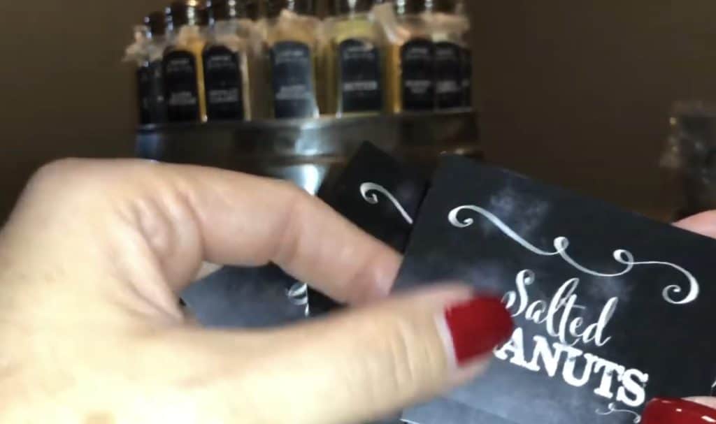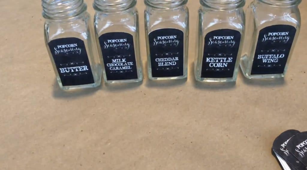 Obviously this step is optional. I did this for our grad party, so it was worth it. If you’re just doing a popcorn bar for Halloween, you could probably just stick with the Kernel Seasons shakers. The Kernel Seasons shakers (shown above) are pretty cute. However, you might consider using other shakers if you’re hosting a popcorn bar at an event where the look of the bar is as important as the taste of the popcorn. The popcorn graphic kit (linked above) included dozens of seasoning label options that can be used on basic salt & pepper shakers.