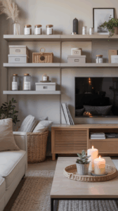 Opt for media consoles, baskets with lids, or decorative boxes to hide everyday items. It keeps the room functional and tidy.