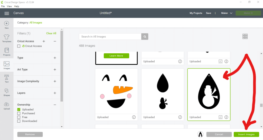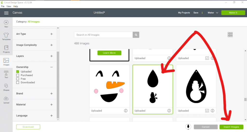 Select the cut file you want to use. Then, click on the insert image button in lower, right-hand corner.