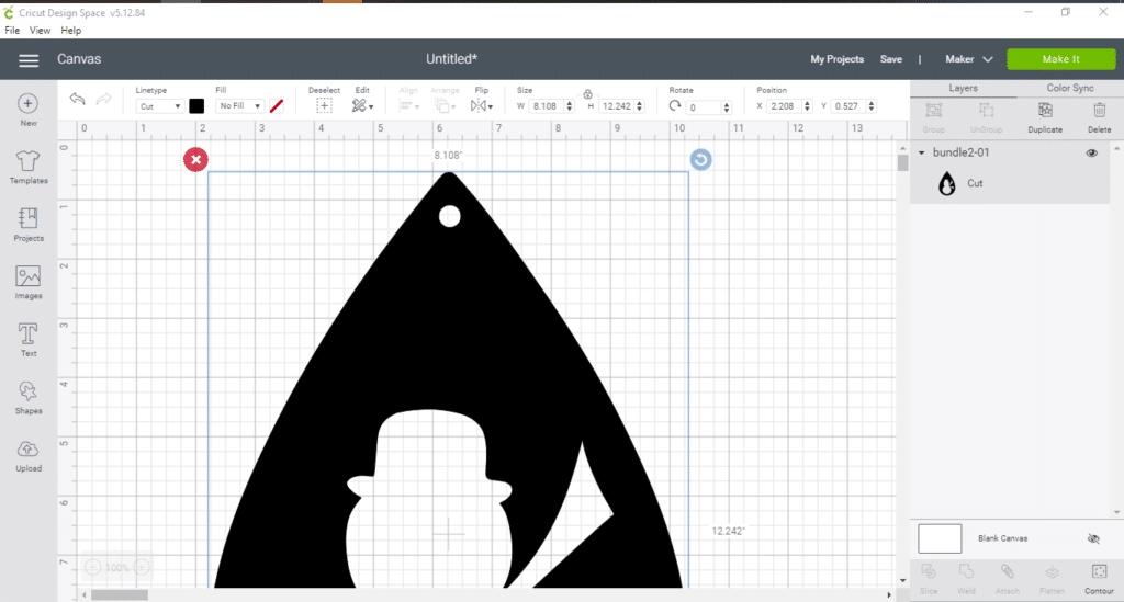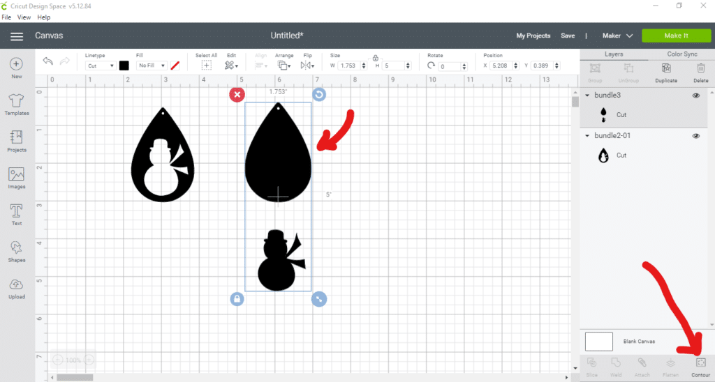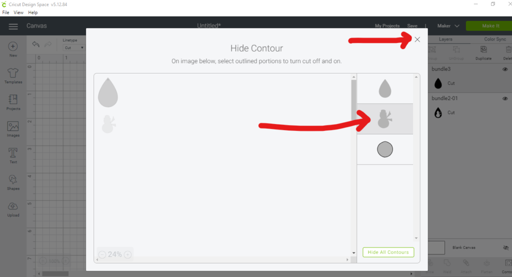 After selecting the contour button, you’ll see a screen showing each part of the file. Click on the snowman so that it is shaded. This is hiding the snowman from your canvas so that it won’t cut. Then click the x to exit out.
