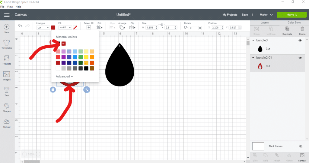 Changing the images to the right color keeps things clear when you’re putting different colors of materials through the cutting machine. Sometimes, the components are grouped together so you have to Ungroup them before you can change colors. (The Ungroup button is in the upper-right-hand corner. We don’t need to do that for this project. We can just go ahead and change the colors. I changed the front layer to red so that I could see it on top of the black (since there isn’t a buffalo check color option).
