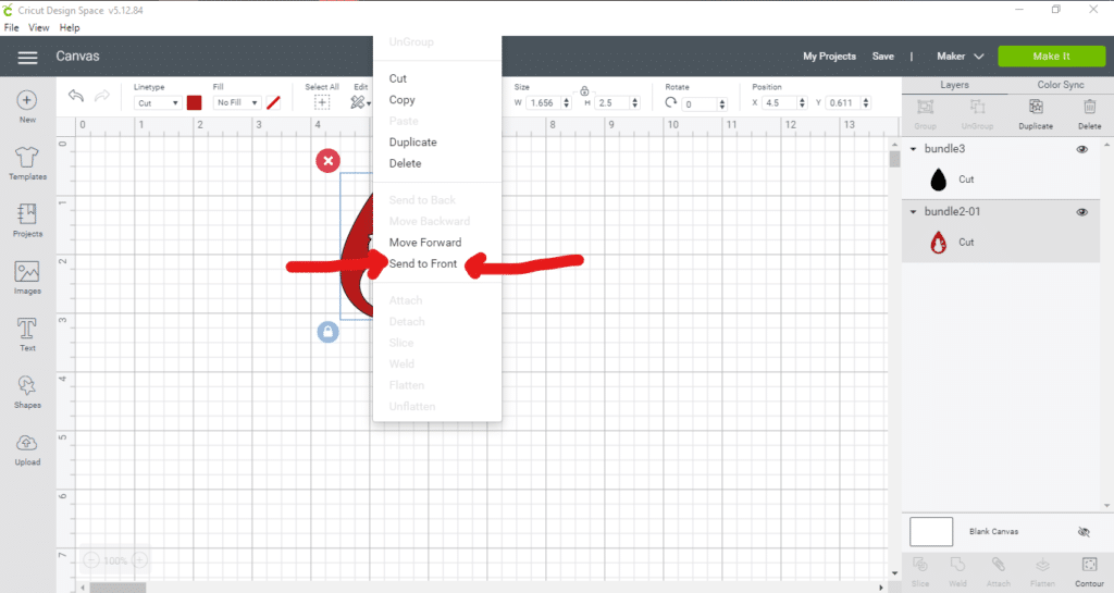 To fix this, right click on the image that you want to move and you’ll see the menu below. If the image is in the back, you’ll see an option to send it to the front. If the image you’ve clicked on is in the front, it will show an option to send it to the back.