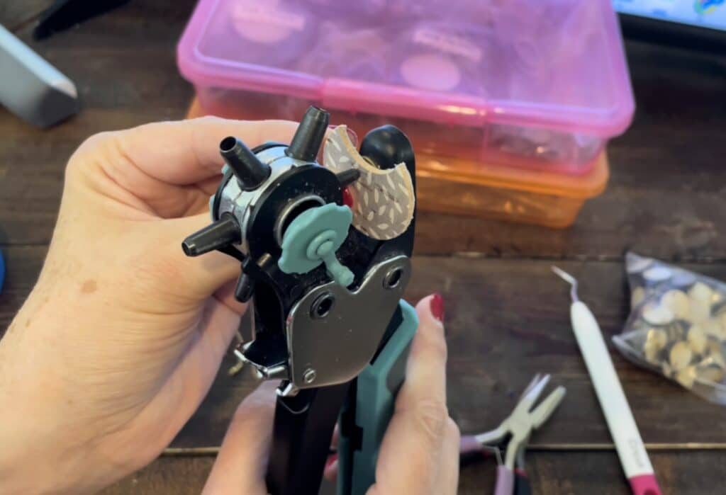 I use a leather punch to put the holes in my diy earrings. This punch cuts through multiple layers of the earring at the same time.