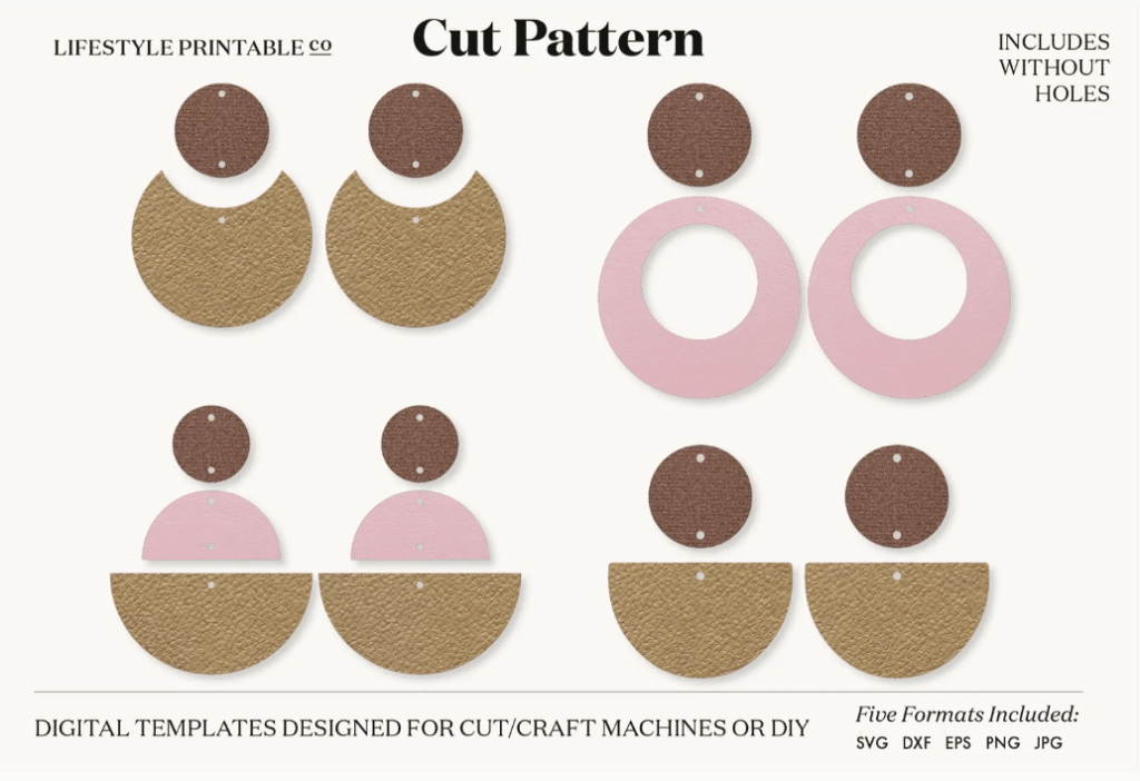 You’ll notice in the image below that the cut pattern for the diy earrings includes the circle shape as well. In this project, I use round wood pieces in place of the round piece.