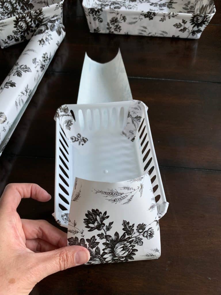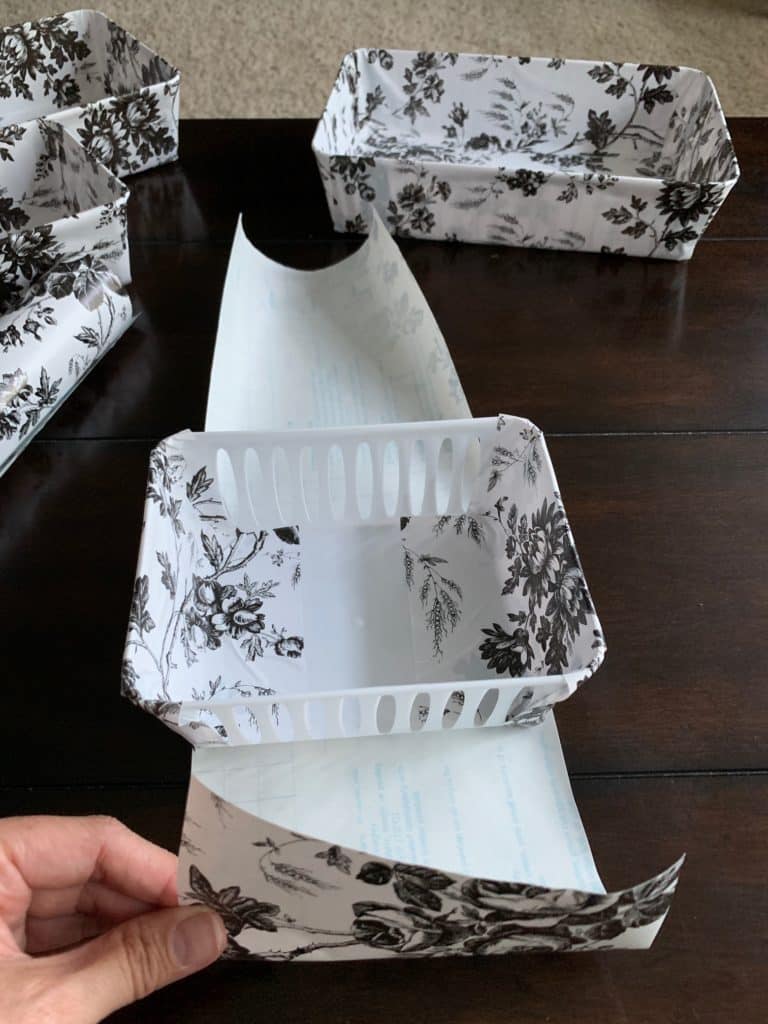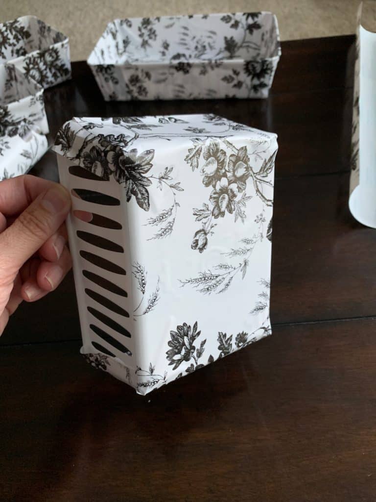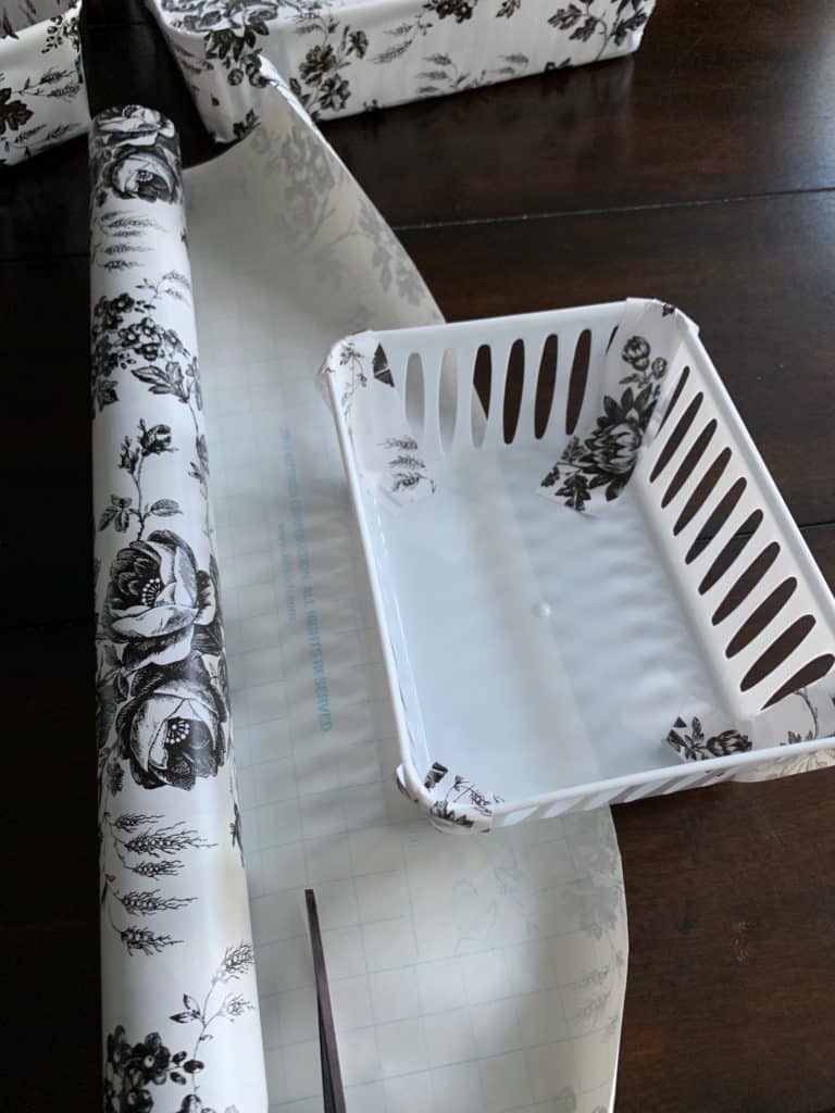 Cut and adhere another strip of contact paper on the wide side of the bin.