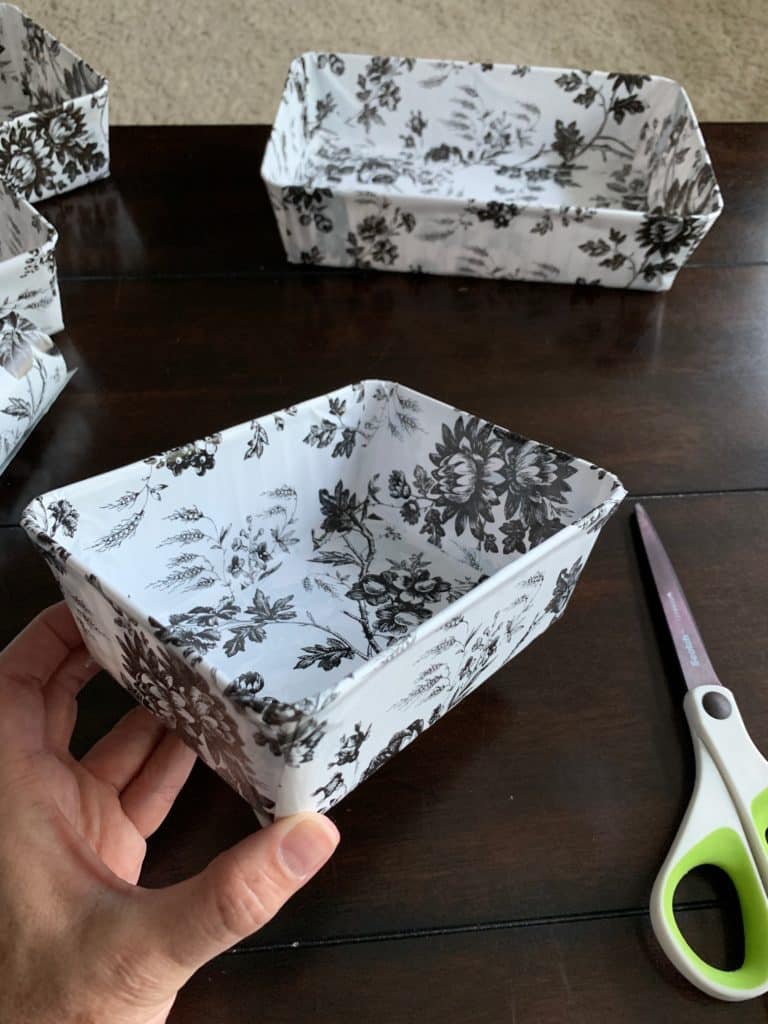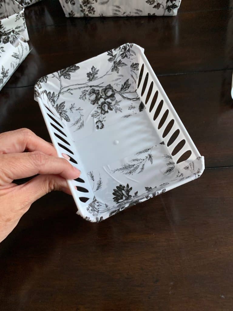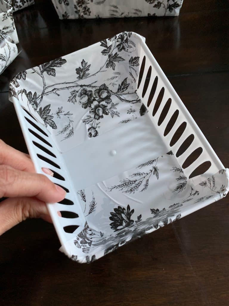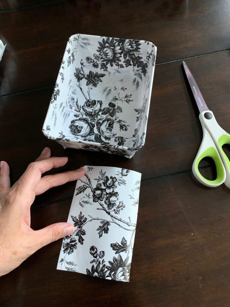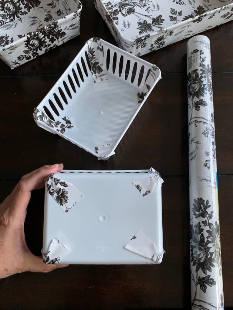 Cut and adhere another strip of contact paper on the wide side of the bin.