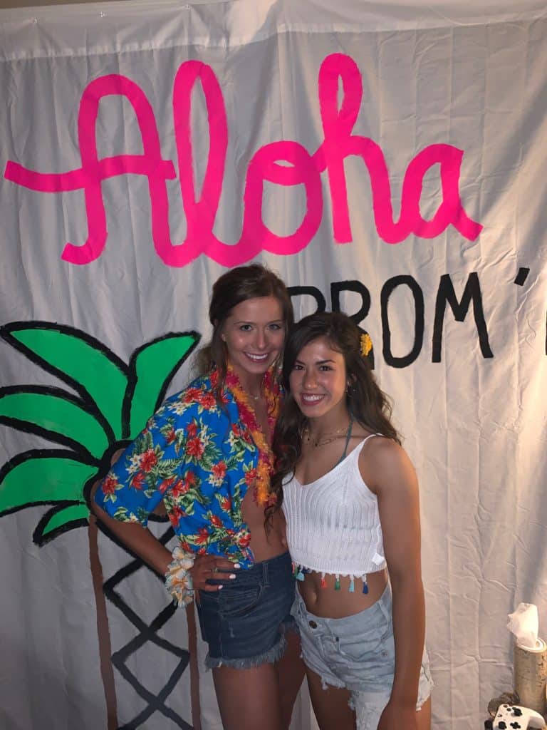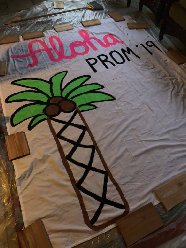 Her and her friend drew the letters and palm tree on the sheet and then painted it using the acrylic paints. They let it dry while at prom and then picked it up on the way to the party.