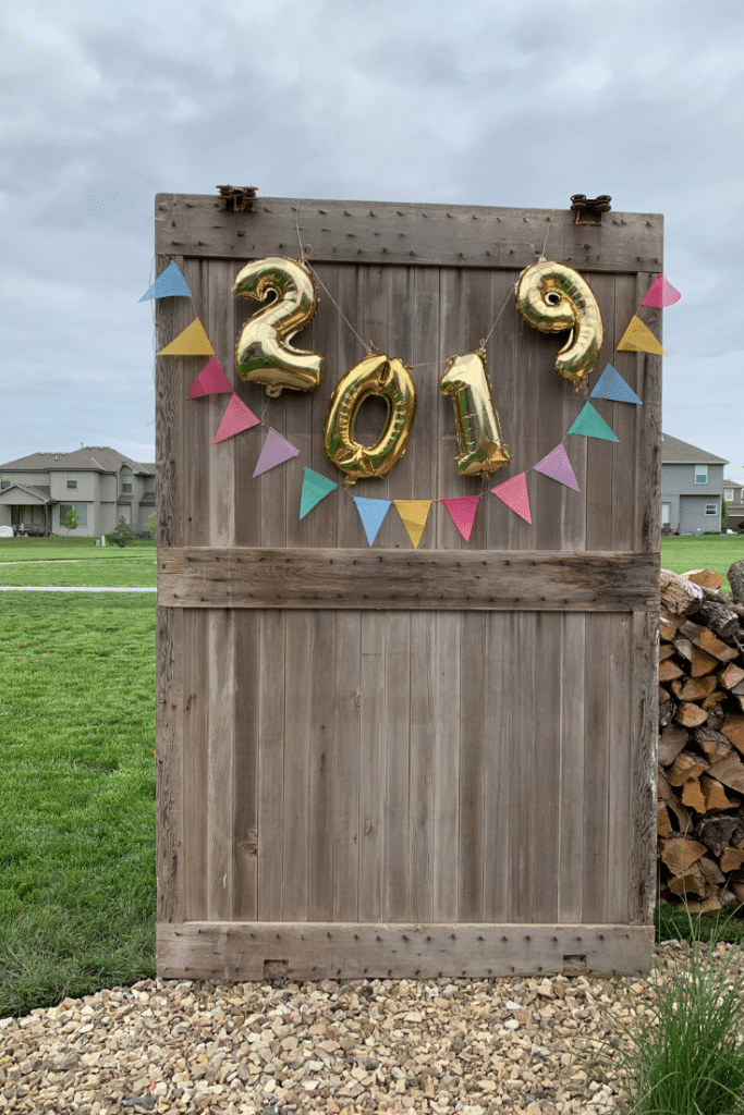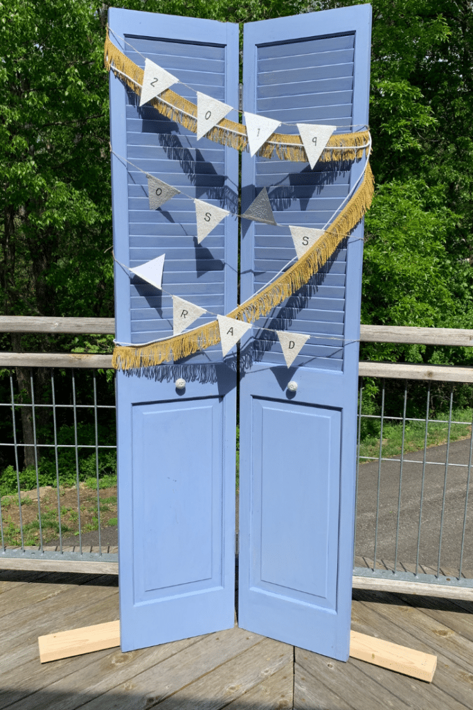 For our girls’ graduation party, my friend Colleen made this custom backdrop using painted shutter doors in our school’s colors. The addition of gold and white banners made the setup pop while proudly displaying the graduation year.