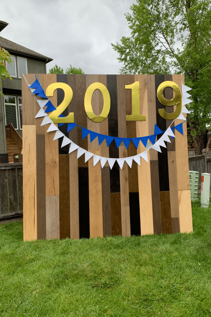 One of my favorite graduation party backdrops featured a variety of wood flooring planks, creating a warm, stylish atmosphere for photos.