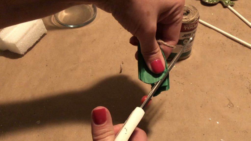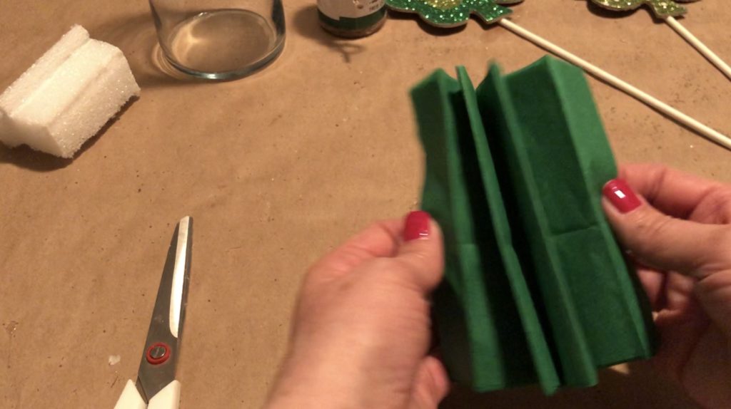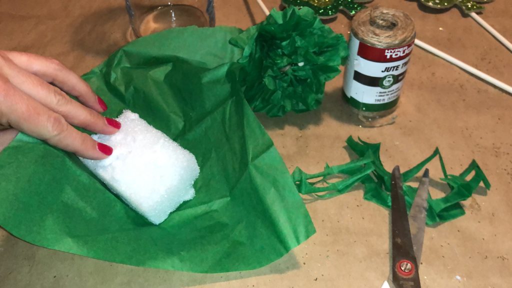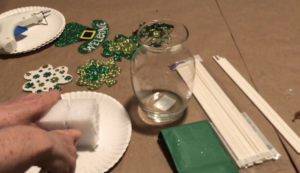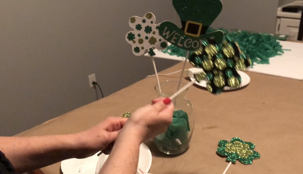 Varying the heights of the decorative sticks adds interest to your St. Patrick’s Day decor piece. Simply break off some of the stick before sticking it into the Styrofoam.