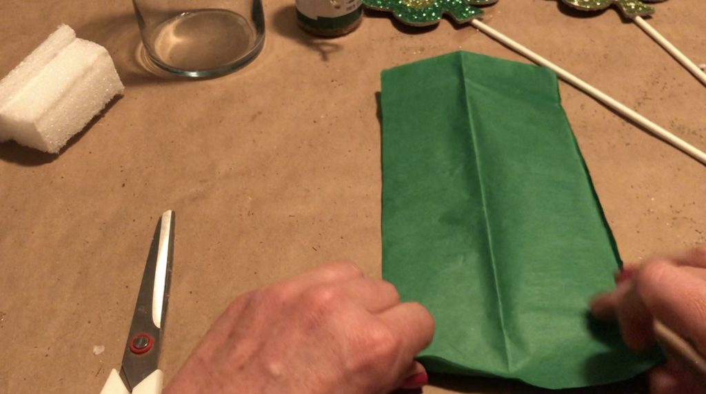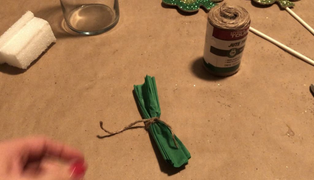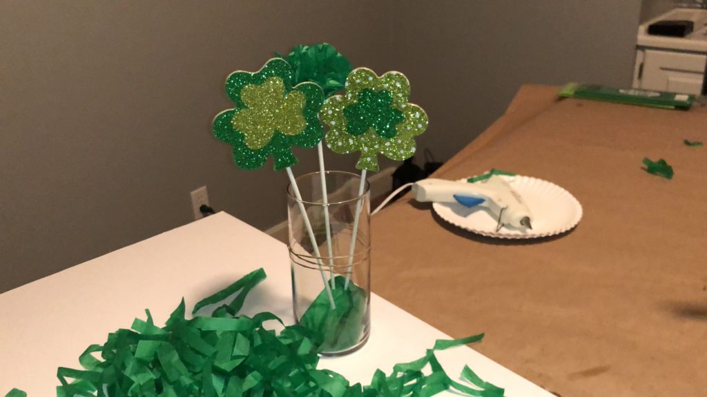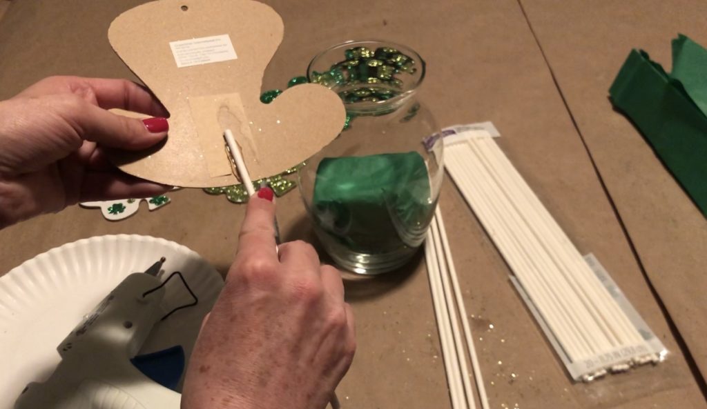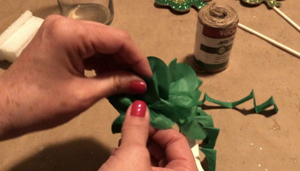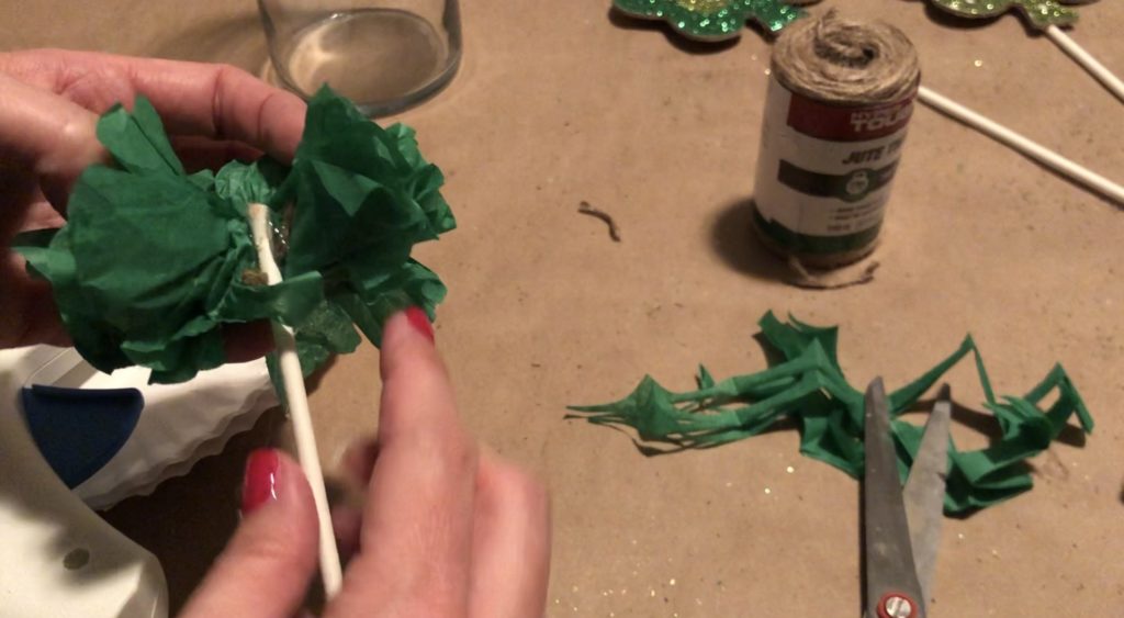I placed my tissue paper flower in the center and a shamrock pick on each side, inserted at an angle. Remember, you can break off part of your treat stick to get varying stick heights.